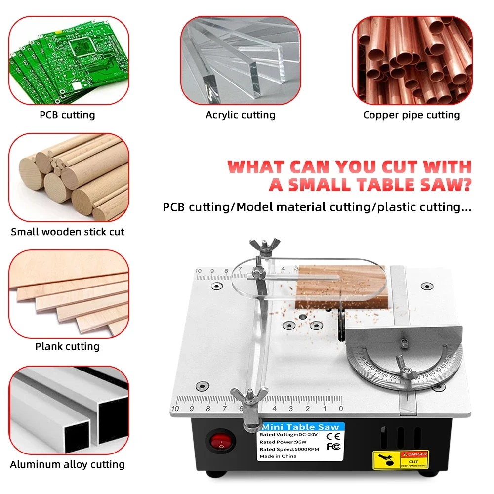 【APPLICATION】Suitable for DIY handicrafts, PCB board, Plastic, Copper Clad Laminate, Acrylic, Thin wood board, Bamboo slice, Aluminum/Copper pipe cutting. With this small table saw you