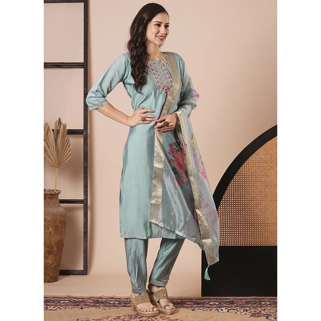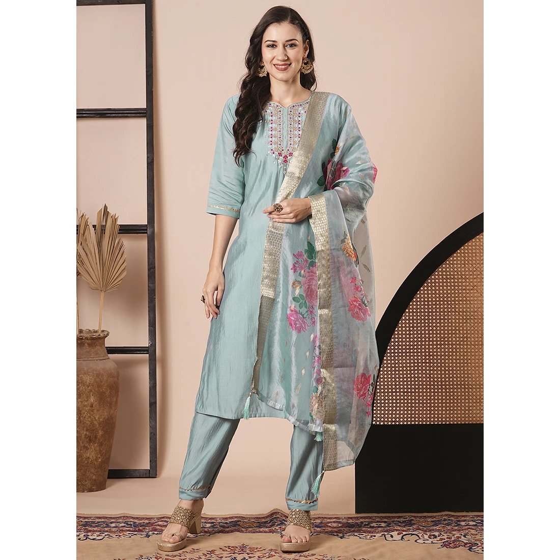 Sky Blue Viscose Chanderi Churidar Kurti Set with Embroidery Work Women's Festival Wear Readymade Set