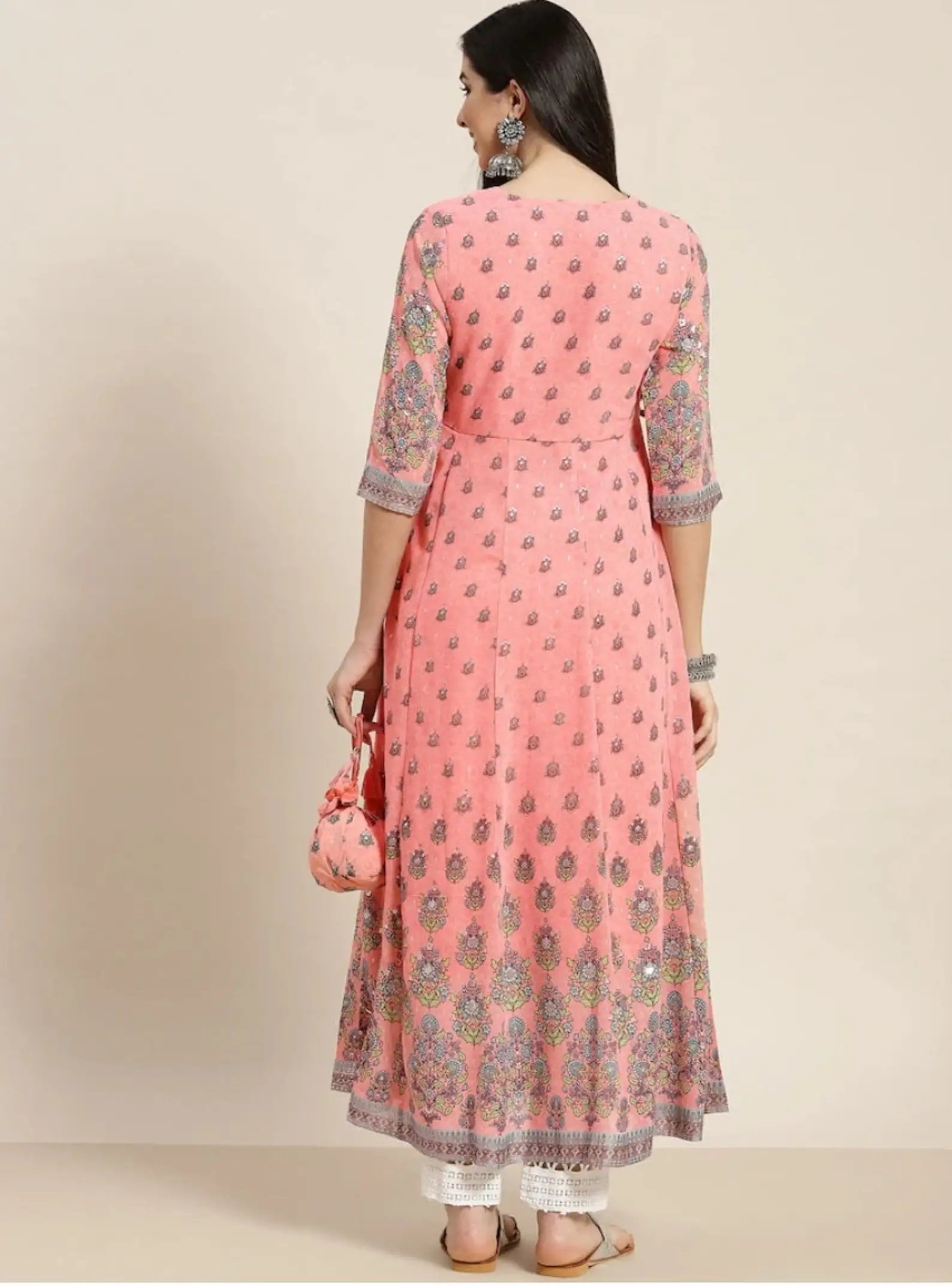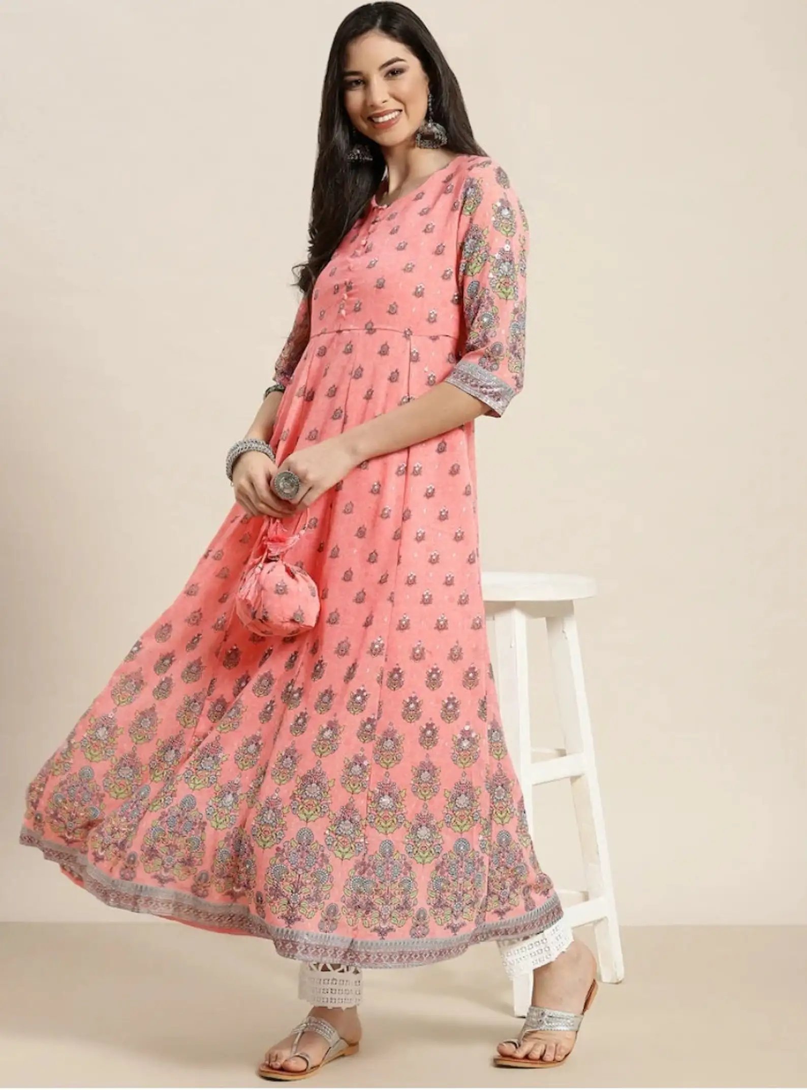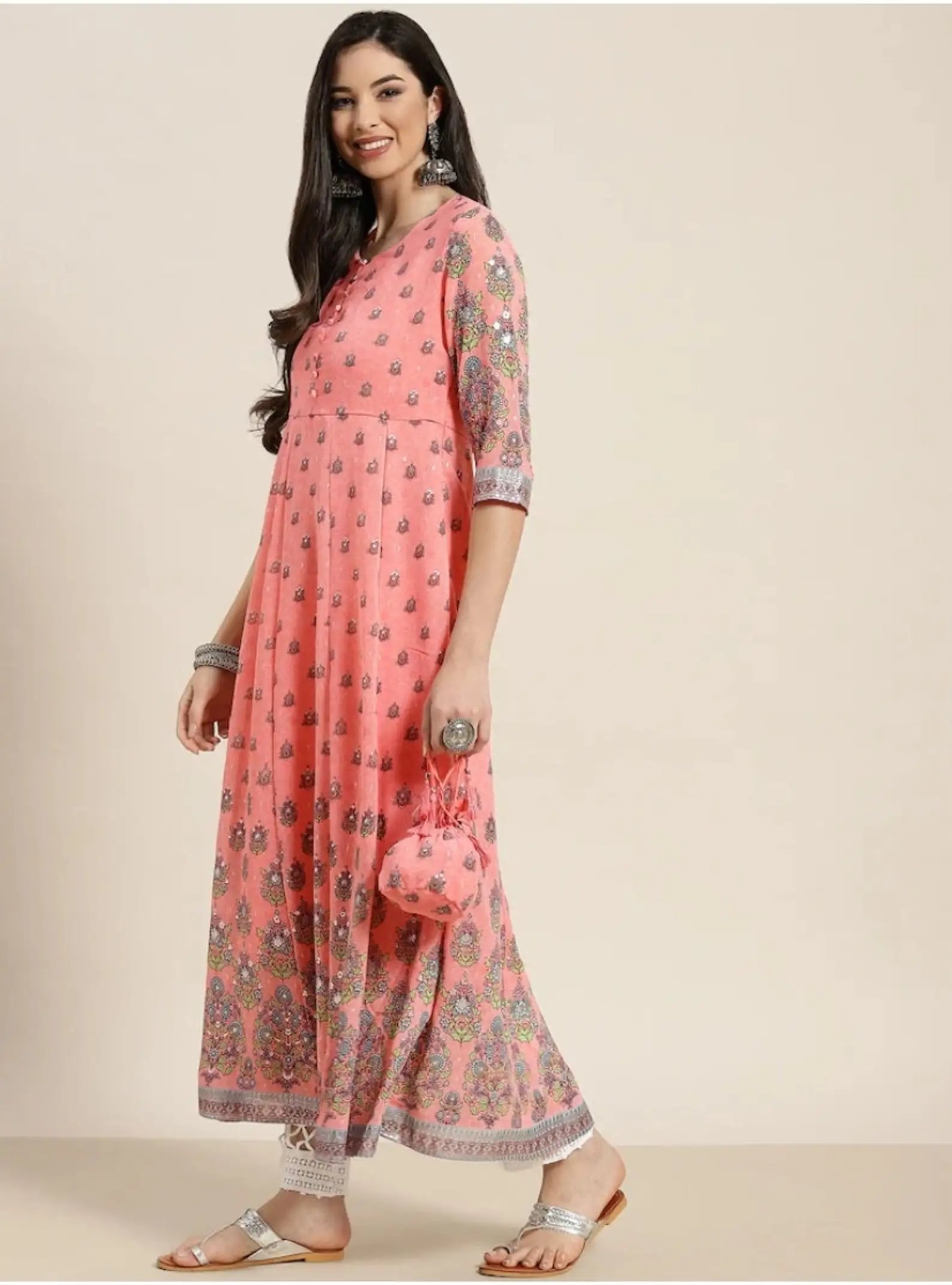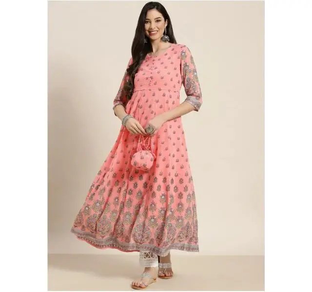 Women's Pink Floral Printed Anarkali Kurta A-line Ethnic Indian Party Wear Dress Plus Size Traditional Kurti Dress